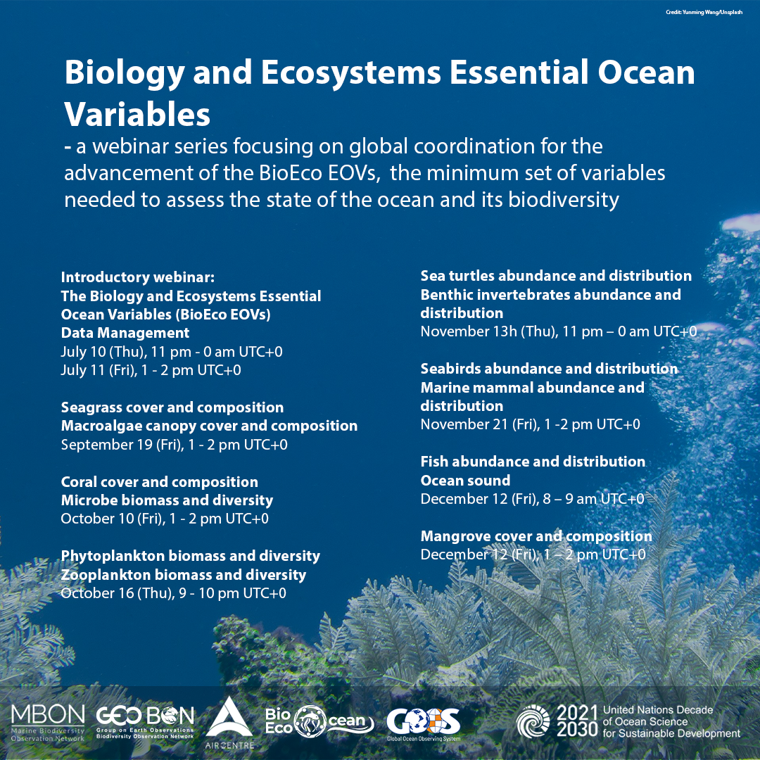 The Global Ocean Observing System (GOOS), the BioEcoOcean EU-project, the Marine Biodiversity Observation Network (MBON) and the Atlantic International Research Centre (AIR Centre) are organising a special webinar series focusing on the Biology and Ecosystems Essential Ocean Variables (BioEco EOVs) - the minimum set of variables needed to assess the state of the ocean and its biodiversity.
